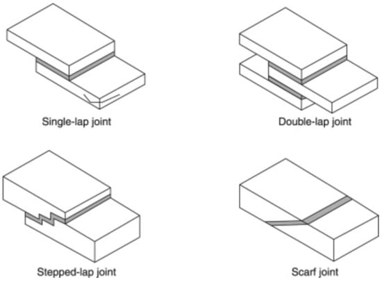 Adhesive joints are created by joining two or more components together using adhesive material [39,40]. The strength of the bond between the surfaces is dependent upon the adhesive material. There are several types of adhesive joints which are single/double-lap joints, scarf joints and stepped-lap joints, as shown in Figure 2.