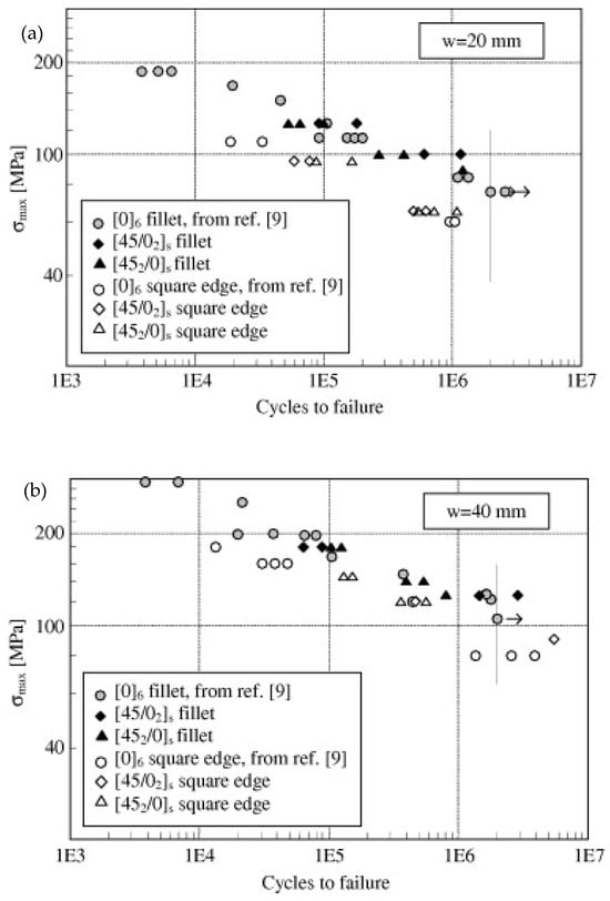 The tensile fatigue life of CFRP adhesive (epoxy adhesive 9323 B/A) joint with different bond lengths: (a) 20 mm and (b) 40 mm. Reprinted with permission from Ref. [45]. Copyright 2024 Elsevier.