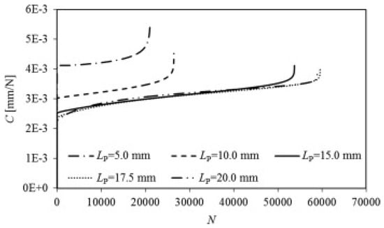 where σ—applied stress or stress amplitude, a—crack length, N—lifetime cycles. The lifetime cycles of the joint can be determined through the integration of the initial to the final crack length, as follows [28]:
