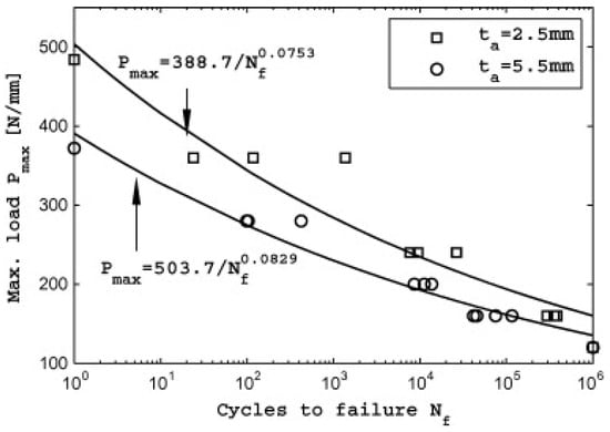 Tensile fatigue life for the bond-line thicknesses of 2.5 mm and 5.5 mm between CFRP and aluminium. Reprinted with permission from Ref. [50]. Copyright 2024 Elsevier.
