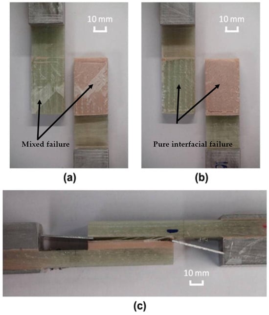 The failure of the above-mentioned joint is shown in Figure 6, where a mixed failure fracture is evident. Each of the joints experienced fracture nucleation between the adhesive and the adherend, especially in the corner between the two sides (Figure 6c). As the number of cycles increased, an interlayer failure caused an initiation of crack propagation on the side of the joint. The crack continues to propagate between the adhesive and the bond before the separation occurs, which results in final fracture failure. The last stage was where the joint split into two components due to interfacial and interlayer propagation [50]. This was confirmed by an investigation conducted by Banea et al. [52] on single-lap joints with silicone adhesives with bond-line thicknesses of 0.5 mm and 1 mm.