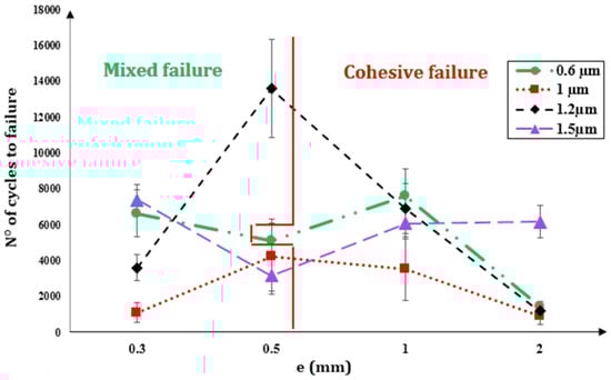 The effects of surface roughness on the fatigue life of adhesive joints were studied by Boutar et al. [55], as shown in Figure 7. Effects of four different surface roughness levels, from 0.6 to 1.5 with different bond-line thicknesses between 0.3 mm and 2 mm on aluminium–copper alloy adherents were investigated. It should be noted that in cohesive failure, a layer of adhesive remains on both surfaces, which means that the crack propagates through the adhesive layer. In case of interfacial failure, cracks occur at the interface between adhesive and joint parts. Practical joint failures have both cohesive and interfacial failure, which are known as mixed failure [56,57].