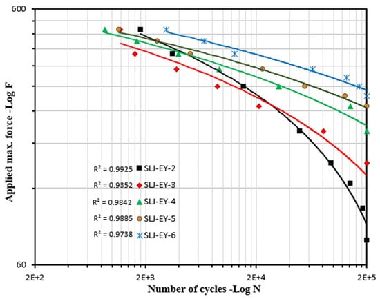 The fatigue life of different adherend thicknesses, where SLJ indicates single lap joint, EY indicates fatigue loading and the numerical values 2, 3, 4, 5 and 6 indicate adherend thicknesses in mm. Reprinted with permission from Ref. [58]. Copyright 2024 Elsevier.
