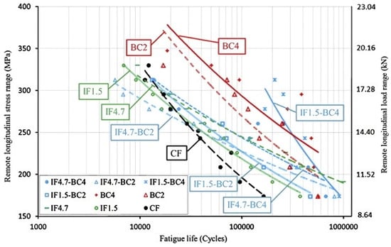 While the thickness of adherends is useful to enhance fatigue performance, the type of materials used in the adhesive joints must also be taken into consideration. This is because some materials have different mechanical properties (such as stiffness, surface energy or thermal expansion) that can sustain such high fatigue loadings and prevent early failure modes. Zhang et al. [64] studied the adhesive single-lap joints between CFRP and aluminium alloy bonded with Araldite adhesives. They reported that (Figure 10), similar joints (CFRP-CFRP, denoted as J-CC) can withstand high fatigue loads with a lower fatigue life without failure compared to dissimilar joints. This suggests that while similar joints were suitable for high loads, they cannot sustain repeated cycles as they will fail quicker due to low fatigue life compared with CFRP–aluminium and aluminium–aluminium joints. Thus, CFRP–aluminium and aluminium–aluminium joints are suitable for long-lasting fatigue performance under cyclic loads as they both endure similar fatigue lives [65,66,67].