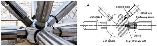 - Sun, G.; Li, B.; Wu, J.; Ma, J. Experimental study on mechanical properties of conical head for bolted spherical joints. Structures 2024, 63, 106293. [Google Scholar] [CrossRef]