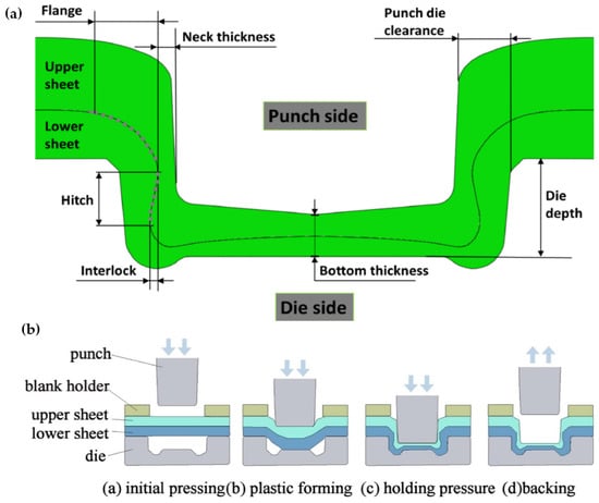 (a) Schematic drawing of clinched joint. Reprinted with permission from Ref. [86]. Copyright 2024 Elsevier. And (b) different steps to form the clinched joint. Reprinted with permission from Ref. [87]. Copyright 2024 Elsevier.