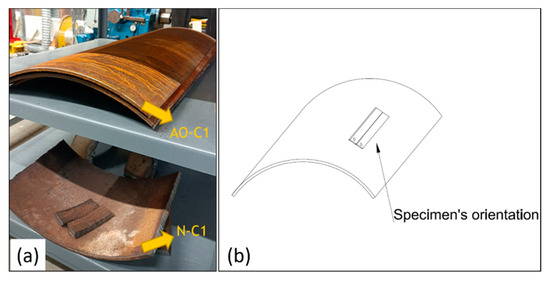 (a) Sections of AO-C1 and N-C1 pipes; (b) specimen orientation.