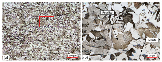 Microstructure of AO-C1 steel: (a) low magnification view; (b) higher magnification of the region highlighted by the red rectangle.