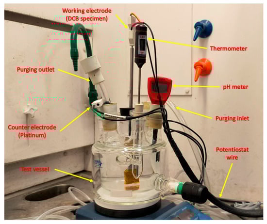 Hydrogen absorption was induced through an electrochemical charging process utilizing the setup illustrated in Figure 6. The test cell, fully sealed to maintain experimental integrity, was equipped with one-sided valves for purging, and additional ports were available for pH and temperature monitoring. The electrolyte consisted of 0.1 M NaOH with 3.3 g/L ammonium thiocyanate (NH4SCN) as a recombination poison, effectively preventing the formation of molecular hydrogen [77]. Prior to testing, the specimens were thoroughly cleaned with acetone to remove surface contaminants, and all the surfaces except for a carefully measured region around the crack tip and ahead of the chevron were masked using insulating tape. This exposed area was accurately accounted for when calculating the required charging current. To ensure a pure environment for hydrogen charging, the test cell was purged with argon gas to displace residual oxygen. The charging process itself was initiated by a potentiostat applying a constant current, facilitating the evolution of hydrogen at the steel surface. Depending on the current requirements, two potentiostats with maximum capacities of 100 mA and 1 A were used, each linked to a computer for precise control over current density and charging duration.
