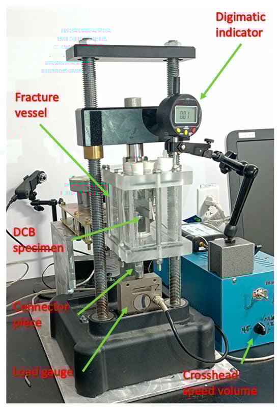Figure 7 shows the test setup for the DCB fracture test. Once the test vessel was installed on the tensile tester, the test commenced with a crosshead speed of 0.5 mm/min. The load data were transmitted by the load gauge and recorded on the connected computer, while the arm displacement was monitored using an absolute digimatic indicator mounted on the fracture vessel assembly. Crack initiation typically occurred during this arm displacement phase of the test, which generally took place within the first few minutes of starting the procedure.