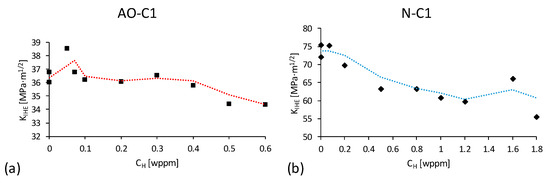 Figure 8a,b shows the calculated values at different hydrogen concentrations (CH) from the fracture tests of the AO-C1 and N-C1 steels, respectively. As seen in Figure 8a, for AO-C1 steel, there was initially a slight increase in fracture toughness for specimens charged with 0.05 and 0.07 wppm hydrogen, compared to the non-charged specimens. However, as CH increased, the values of gradually decreased. At CH = 0.2 wppm, it dropped to 36.1 MPa·m1/2 (a decrease of 0.8%), and at CH = 0.5 wppm, it decreased to 34.4 MPa·m1/2, reflecting a 5.5% reduction. This indicates that while there is a decreasing trend, the hydrogen content, at least within the range tested in this study, has only a mild effect on the fracture toughness of AO-C1 steel.