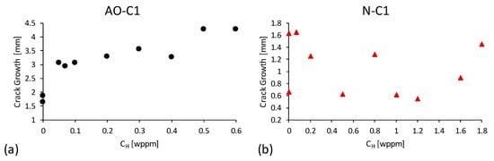 Although does not show a significant decrease due to hydrogen in AO-C1 steel, post-test crack growth measurements (which show substantial increases with higher CH content) provide more insight into hydrogen’s impact during crack propagation. Hydrogen can accelerate crack growth after initiation by weakening grain boundaries and promoting decohesion, even if the initiation itself (as measured by ) is not strongly affected. This highlights a discrepancy between the initiation and propagation stages, where hydrogen’s influence becomes more pronounced after crack initiation. Figure 9a illustrates the crack growth of AO-C1 specimens at different hydrogen concentrations. Similar conclusions were drawn by Chatzidorous [66], who found that the crack tip opening displacement (CTOD) of hydrogen pre-charged specimens of the highly ductile X42 alloy is a more suitable parameter for assessing crack growth resistance compared to calculations based on linear elastic fracture mechanics.