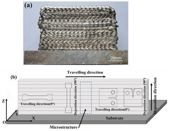 In the present work, an Al-Mg-Sc-Zr alloy welding wire was used as the filler metal for the WAAM process, and the wire was manufactured by Hangzhou Kunli Welding Material Co., Ltd. (Hangzhou, China). Table 1 shows the chemical compositions of the filler wire, which were determined by the method of inductively coupled plasma optical emission spectroscopy (ICP-OES). The WAAM process was conducted on an ARCMAN@ P1200 workstation produced by Nanjing enigma automation Co., Ltd. (Nanjing, China). For the photo and corresponding characteristics of this workstation, one could refer to our previous work [21]. The process parameters of additive manufacturing are shown in Table 2. The welding current is 160 A, the wire feed speed is 8 m/min, and the scanning speed is 1.8 m/min. The final macro-morphology of the component and the sampling position of the test samples are shown in Figure 1a and Figure 1b, respectively.