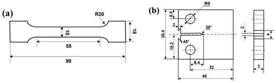 (a) The size of the sample for the tensile test; (b) the size of the sample for the fatigue crack growth test (unit: mm).