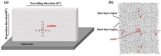 The residual stress of the as-deposited alloy component along the traveling direction (0° direction) and the deposition direction (90° direction) was measured by the X-ray diffraction method. The sampling position of the alloy components for residual stress measurement is shown in Figure 3. Five test points of the component along the 0° direction and six test points along the 90° direction were selected for the measurement, and the public test point of the 0° direction and 90° direction was identified as the center point. The intervals (along the same direction) of the measured points were all 5 mm, and there were two points along the 90° direction located on the interlayer area.