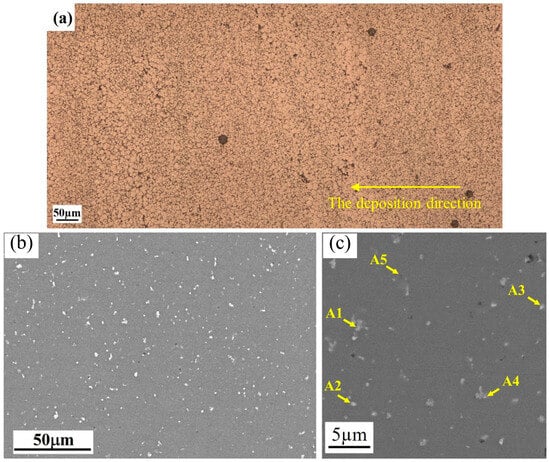 Microstructure of the as-deposited Al-Mg-Sc-Zr alloy sample: (a,b) optical microscope image; (c) SEM images.