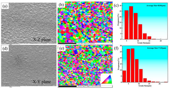 SEM and EBSD images and the corresponding grain size distribution of the as-deposited Al-Mg-Sc-Zr alloy in different sampling directions: (a,b) SEM and EBSD images of X-Z plane; (c) grain size distribution corresponding to the X-Z plane; (d,e) SEM and EBSD images of X-Y plane; (f) grain size distribution corresponding to the X-Y plane.