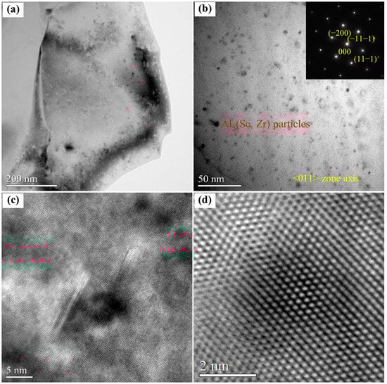 Figure 6 shows the TEM images of the as-deposited Al-Mg-Sc-Zr alloy prepared by WAAM. Although the corresponding Selected Area Electron Diffraction (SAED) pattern indicates that there is only the signal of the Al matrix, the nanosized second phases are evident in the grain as shown in Bright-Field (BF) TEM images (Figure 6a,b). The HRTEM images shown in Figure 6c,d indicate that the size of this second phase is around 5 nm. The morphology and size imply that these second phase should be secondary Al3(Sc, Zr) particles, which are precipitated under the condition of a thermal cycle during the process of WAAM. These fine Al3(Sc, Zr) particles with a sub-nano size were also found in the laser powder bed fusion (L-PBF)-fabricated Al-Mg-Sc-Mn-Zr alloy [27].