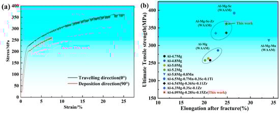 (a) Stress–strain curve of the of the as-deposited Al-Mg-Sc-Zr alloy along the traveling and deposition directions; (b) comparison for the mechanical properties of the present work and reported previous works on the Al-Mg-based alloy prepared by WAAM [12,19,25,30,31,32,33,34].
