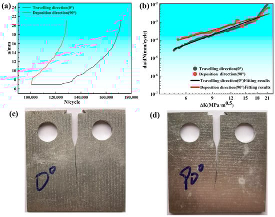 (a) Crack length and fatigue cycle (a−N) curves; (b) FCG rates of the samples along different sampling directions; (c,d) are the macro-morphology images of the sample after the fatigue crack propagation test along the traveling direction (0° direction) and deposition direction (90° direction), respectively.
