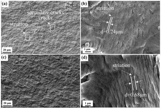The processes of fatigue crack failure mainly include three stages: crack initiation, crack propagation, and crack instability, and crack propagation is considered to be one of the key factors to affect fatigue life. Figure 9 shows the fatigue fracture morphology in the crack stable growth zone of two samples. Figure 9a,c depict that the fracture surface has a layered structure and is uneven, which is because the deviation in grain boundary orientation hinders the expansion of fatigue cracks, and therefore large numbers of fatigue steps are formed. The fracture surface roughness and the secondary crack numbers are also different in two samples. The fracture surface in the sample along the 0° direction is rougher and has more secondary cracks than that in the sample along 90° direction. The secondary cracks suppress the crack growth rate by consuming the energy of the crack tip [36] and therefore improve fatigue resistance. Figure 9b,d show the fatigue fringe morphology of the samples along two different directions, and the corresponding fatigue fringe widths are 0.24 μm and 0.68 μm, respectively. Under the condition of alternating stress, fatigue fringes are initiated by continuous crack passivation and sharpening modes [37]. The spacing of fatigue fringes represents the distance of crack propagation in a loading cycle. The smaller the width of the fringes, the slower the crack growth rate and the better the fatigue resistance. The fatigue fringe widths (0.24 μm) of the sample along the 0° direction suggests that the fatigue resistance of the sample along the 0° direction is better than that of the sample along the 90° direction, which is in good agreement with the results shown in Figure 8.