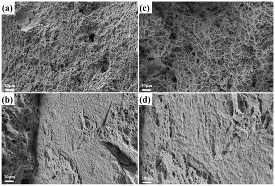 The fracture morphology of tensile test samples along two different directions: (a,c) the traveling direction (0° direction); (b,d) the deposition direction (90° direction).