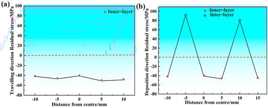Residual stress distribution along two different directions: (a) the traveling direction (0° direction); (b) the deposition direction (90° direction).