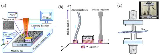 Schematic representation of (a) LPBF process for Ti–6Al–4V (SEM image of raw powder particles at inset); (b) Z-built clavicle bone plate, cuboid, and tensile specimen; (c) a 4-point bending test for clavicle bone plate.