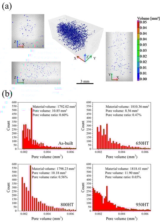 Regarding the pore volume distribution (Figure 2b), there are no pores with a volume greater than 0.004 mm3. For as-built, the relative density was measured to be 99.79% by the Archimedes method; on the other hand, the pore density was measured to be 0.60% (pore volume of 10.85 mm3 with a part volume of 1792 mm3). The pore density values of the annealing conditions were 0.47%, 0.55%, and 0.65% for 650 HT, 800 HT, and 950 HT, respectively. Since it is hard, by only thermal treatment is it possible to remove or alleviate the pores inside the specimen [21,23], so the pore characteristics were unchanged after thermal annealing. The analysis result of these micro-sized pores across a considerable range, coupled with the good relative density of the as-built Ti64 alloy, further substantiates the printing quality and contributes to the microstructural characterization related to the development of mechanical properties discussed in the following sections.