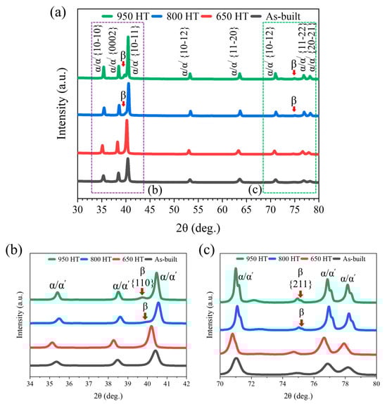 X-ray peaks (Figure 3a) of the as-built and heat-treated specimens illustrate the presence of various phase constituents alongside their respective ranges of diffraction angles (2θ). Magnified images of the marked locations (2θ = 34–42° and 70–80°) reveal phase evolutions after thermal annealing, along with their respective crystallographic orientation planes, as shown in Figure 3b,c. It is confirmed that only α/α’ hexagonal close-packed (hcp) martensitic phases are predominantly present in the as-built Ti64. The α/α’ phase peak intensity reached its maximum at the () plane at 2θ = 40°. Since α and α’ represent nearly identical crystallographic structures and lattice parameters, distinguishing them through XRD analysis is challenging; thus, they are characterized as α/α’ within the peak profiles [15]. The martensitic phase in the as-built specimen exhibited generally solely α’, which is a distorted form of the α-stable martensite phase formed due to rapid solidification during LPBF. In addition to the highest peak intensity, α/α’ phase components also appeared at the , , , , and hcp planes within the 2θ range from 35° to 78°.
