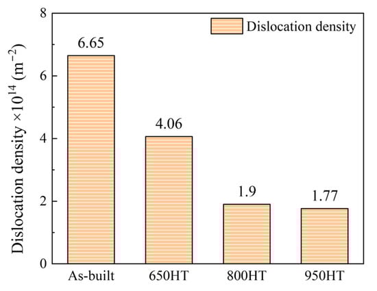 Dislocation density estimated by XRD peak analysis for as-built, 650 HT, 800 HT, and 950 HT.