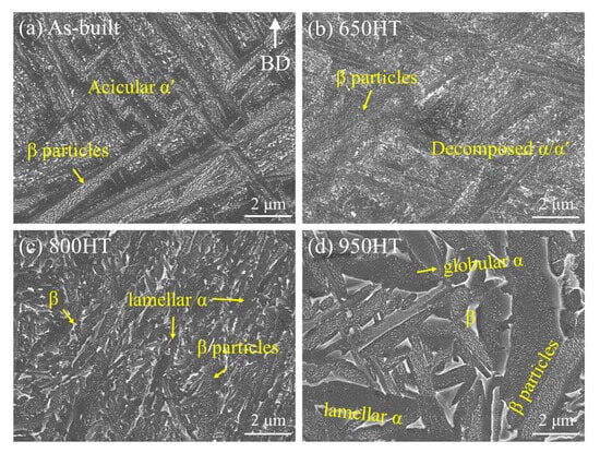 Figure 5 presents SEM images of the as-built, 650 °C heat-treated (650 HT), 800 °C heat-treated (800 HT), and 950 °C heat-treated (950 HT) conditions along the Z-build direction. The microstructure of the as-built condition reveals a predominant α′ martensitic structure along with white nanosized particles, which are expected to be V-enriched β precipitates formed during the LPBF process due to the low solubility of vanadium (V) in the α phase within the α’ lath structure [26,27]. Given the limited resolution of X-ray scans for detecting these nanosized particles, the XRD analysis did not exhibit a peak corresponding to the β phase (Figure 3). It is observed that the number of nanosized particles decreased with increasing annealing temperature, likely due to the diffusion of V into the matrix during the annealing treatment. The formation of the α′ martensitic structure primarily resulted from the diffusionless transformation of β phases during the subsequent rapid solidification of molten Ti64 powder deposited in layers during the LPBF process [18]. Furthermore, it was found that annealing at 650 °C was insufficient for the formation of β lamellar phases, although decomposition of the α′ phase occurred.