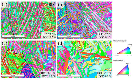 Inverse pole Figure (IPF) maps of the (a) as-built, (b) 650 HT, (c) 800 HT, and (d) 950 HT. The prior β grain boundaries are marked with black dashed lines.