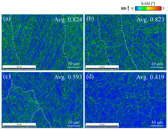 The KAM maps (Figure 7) indicate a higher average KAM value of 0.824 in the as-built condition, reflecting an overall distorted lattice structure. The primary cause of the elevated KAM values at the as-built samples is rapid overlapping of solidified layers, which generates residual stress [18]. Following the annealing process, the average KAM value decreased from 0.823 in the 650 HT condition to 0.419 in the 950 HT condition, indicating a relief of residual stress and a reduction in dislocation density within the as-built Ti64 alloy. Notably, the KAM value was not significantly higher at the prior β grain boundaries, suggesting an independence between local distortion and the prior β grain boundary. Since the KAM value serves as an indicator of the geometrically necessary dislocation (GND) density in a localized region [32,33], the total dislocation density calculated through XRD analysis exhibited a similar trend, with dislocation density increasing as the annealing temperature rises.