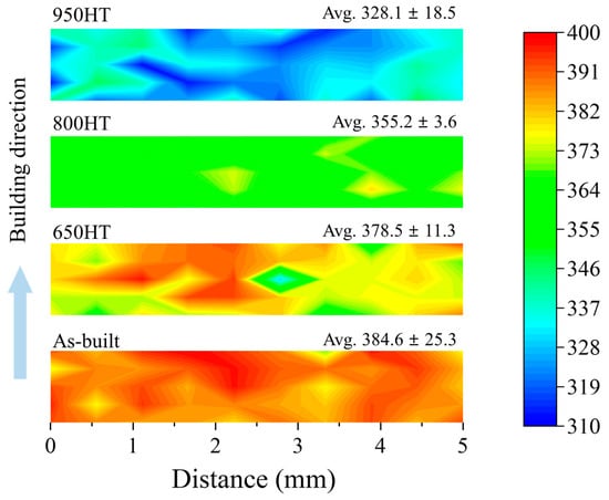 Surface hardness maps sequentially for as-built, 650 HT, 800 HT, and 950 HT, respectively. Hardness decreased as the thermal annealing temperature increased to 950 HT condition.