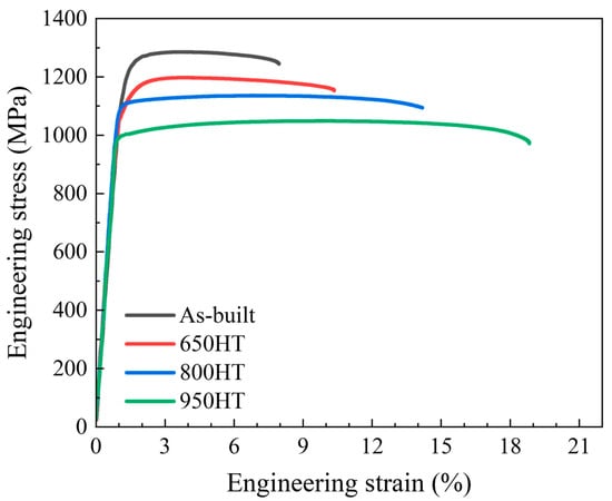 Engineering stress–strain curves for as-built, 650 HT, 800 HT, and 950 HT specimens.