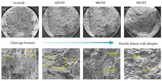 SEM fractography and magnified tensile fracture surface images for (a,e) as-built; (b,f) 650 HT; (c,g) 800 HT; (d,h) 950 HT. The fracture mode change from quasi-cleavage failure of as-built to ductile failure of 950 HT specimen.