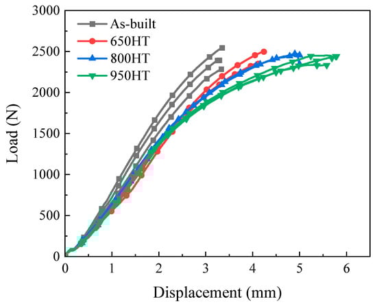 Plots of 4-point bending behavior (force–displacement curve) for various annealing treatment conditions: as-built, 650 HT, 800 HT, and 950 HT.