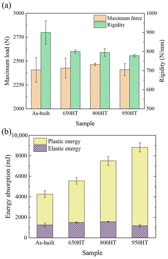 Although the as-built specimens demonstrated higher rigidity, their lower energy absorption capacity promoted premature bending failure. In contrast, the energy absorption capability increased significantly after annealing, as shown in Figure 12b and Table 4. Therefore, the much higher capability of plastic energy absorption in the heat-treated specimens can delay the bending failure of the clavicle bone plate. Notably, both the elastic and plastic energy absorption increased in the 650 HT and 800 HT conditions, while only the plastic energy absorption showed a significant increase in the 950 HT case. After annealing at 950 °C, the as-built parts exhibited maximum flexibility characterized by the lowest bending rigidity of 778.38 N/mm and the highest energy absorption capability of 8830.52 mJ among all three conditions. However, considering the critical importance of elastic deformation in medical implants, the heat treatment temperature of 800 °C may represent the most optimal condition due to its superior elastic energy absorption properties in this work.