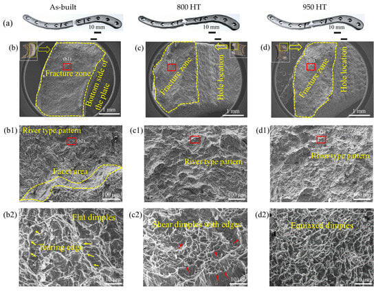 (a) Pictographs of the broken specimens after bending tests and corresponding SEM images reveal morphologies of fracture zone for (b–b2) as-built, (c–c2) 800 HT, (d–d2) 950 HT. The yellow and red arrows indicate the tearing edges and shear dimples, relatively.