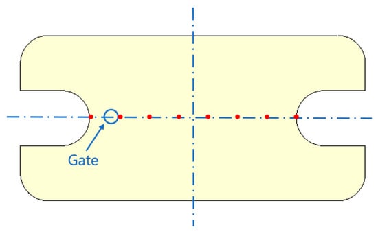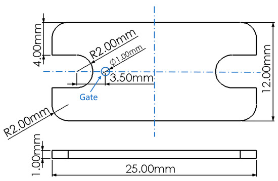 For this study, a typical flat plate model was chosen for powder injection molding, as depicted in Figure 1. The point gate was selected to investigate the patterns that affect the separation of powder and binder in the component and to optimize the separation by varying the process conditions. The gate has a diameter of 1 mm and a length of 1.5 mm.