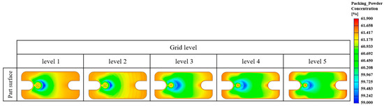 Figure 2 is the distribution of powder volume concentration on the surface of the part obtained by five different mesh simulations. Comparisons find that the simulation results of different mesh levels have little effect, and as the level of mesh accuracy increases, the results obtained by powder distribution become more accurate. This indicates that the grid independence meets the requirements. Considering the simulation’s requirement for accuracy and efficiency, the final choice is level 4 mesh, with the part being divided as shown in Figure 3.