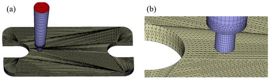 Mesh division drawing: (a) the overall mesh model, (b) enlargement of the mesh model.