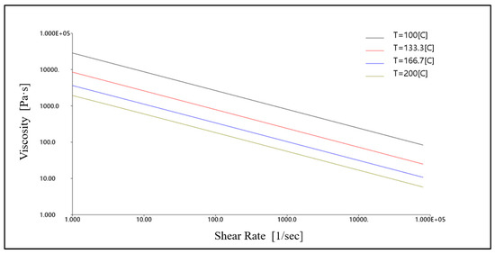 Since the study feedback exhibits a shear-thinning nature (the viscosity decreases as the shear rate increases), its effect on temperature, pressure and viscosity is characterized by the Cross–WLF viscosity model [19]:
