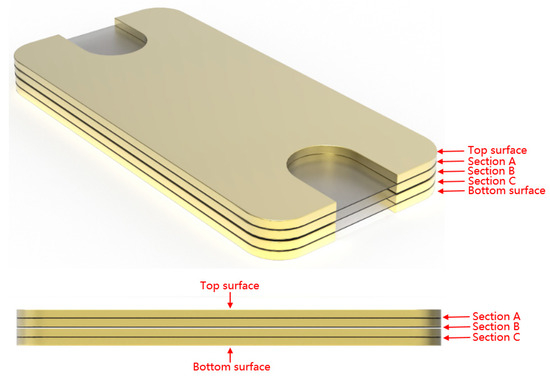 For further investigation, the part was sliced at intervals of 0.25 cm in the thickness direction, as illustrated in Figure 5. The subjects of study were selected as top surface, bottom surface and sections A, B, and C, which were spaced at the same intervals.