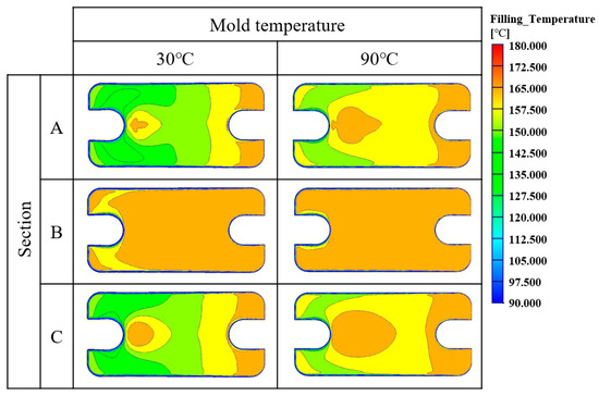 Figure 6 displays the temperature field distribution of section A, B, and C at different mold temperatures. The melt flows through the gate and spreads outwards in a corrugated pattern, leading temperatures to decrease initially along the flow direction away from the gate and then increase at the end of the mold cavity. This is because the melt, with a high temperature, gradually cools. By the end of the filling process, due to the friction between the flowing melt, the temperature rises again. Furthermore, the minimal variation in the temperature field on the left side of the mold cavity is due to the swift cooling of the melt. When the mold temperature is 30 °C, section A and C show a large temperature gradient in the back half of the mold cavity. It is important to note that temperature has a major impact on the viscosity of the melt, as it decreases with increased temperature. Fang et al. found that if the viscosity near the gate region is too low, the powder will obtain a faster speed than the binder, and powder content will be rich in the flow front, as the drag force between binder and powder decreases [14].