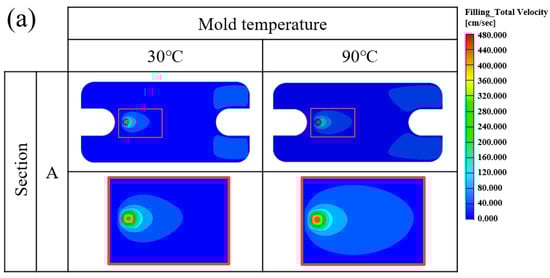 Figure 7 displays the velocity field distributions of section A, B, and C at the end of filling at different mold temperatures. It can be seen that a sharp increase in velocity occurs at the gate, with it gradually decreasing along the flow direction. In section A, the melt enters the mold cavity at a high velocity due to the drastic reduction in flow area. When magnifying the velocity field at the gate, it is evident that the velocity contours are tightly packed with a steep gradient in a small area. This is because of the temperature field, which indicates a decrease near the gate, leading to an increase in viscosity and frictional forces, causing a sudden decrease in shear rate in a small area, so there is a steep velocity gradient, just as depicted in Figure 7a. As mentioned earlier, a sharp drop in viscosity around the gate can seriously affect separation, creating binder-rich areas.