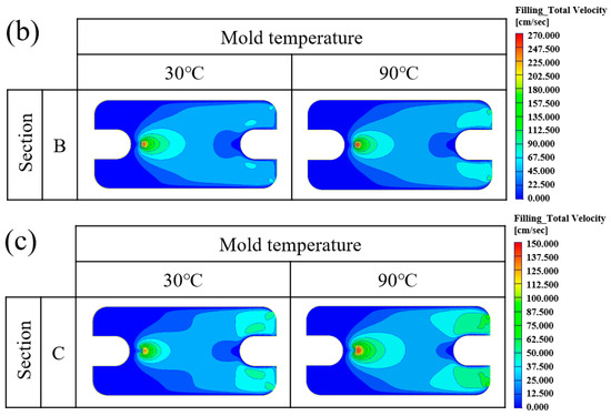 Velocity field distribution at different mold temperatures: (a) Section A; (b) Section B; (c) Section C.