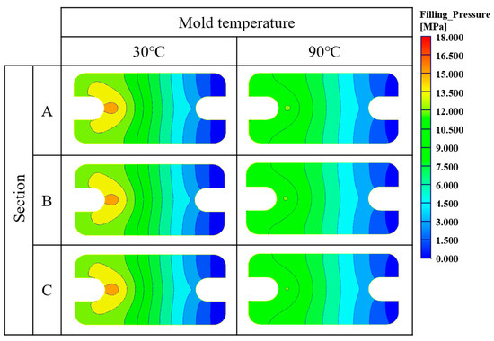 Figure 8 illustrates the pressure field distribution of section A, B, and C at the end of filling at different mold temperatures. The figure shows a gradual decrease in pressure from the gate to the melt flow path, which is reflected in the distribution of temperature and velocity fields. As the temperature rises, causing a decrease in flow rate and viscosity, the flow resistance becomes smaller, along with the injection pressure. At a mold temperature of 30 °C, there is a larger temperature difference, resulting in a relatively more intensive pressure field distribution with a larger gradient. This may cause uneven shrinkage and collapse defects in the parts. However, increasing the mold temperature to 90 °C results in a more uniform pressure field distribution and the disappearance of excessive local pressure at the gate. That is to say, a higher mold temperature leads to more even flow and distribution of the powder.