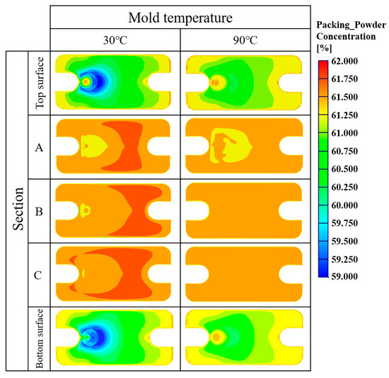 Figure 9 illustrates the distribution of powder volume concentrations of top and bottom surfaces of the part and sections A, B, and C after the packing stage at different mold temperatures. From the sections, at a mold temperature of 30 °C, the powder volume concentration is lower at the gate, but notably increases in the middle portion. According to the temperature and velocity fields, it is evident that the initial entry of the melt with extremely low viscosity leads to the separation of powder and binder, causing binder-rich areas at the gate. As the melt flows towards the middle, the viscosity increases with the decreased temperature, leading to a slowdown of the powder. When the melt reaches the tail end, the temperature rises, decreasing viscosity again. However, in this case, the viscosity fluctuation is relatively flat and the rate of change decreases, which helps to improve melt mobility and the combination of powder and binder. When the mold temperature reaches 90 °C, both the binder-rich areas and the powder accumulation areas in the middle part are significantly reduced. This is because the temperature gradient decreases, which can effectively reduce the degree of viscosity change and flow resistance. Within a certain range, the reduction in viscosity is conducive to promoting more uniform powder filling.